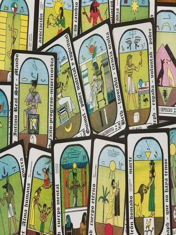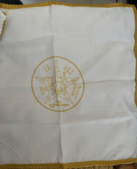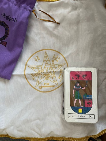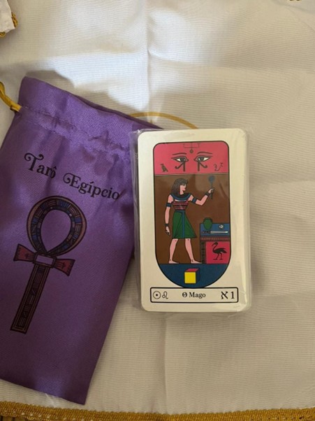يشمل على الأوراق المصرية برسمتها القديمة، ومعه حافظه الطاقة الغنوصية، والمفرش المستخدم في المذبح عند مغنطه التارو وعند قراءته.